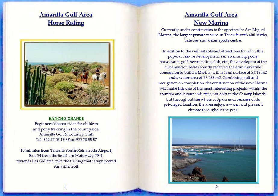 RANCHO GRANDE, Amarilla Golf & Country Club, 10 minutes from Tenerife South-Reina Sofia Airport, Exit 24 from the Southern Motorway TF-1, towards Las Galletas, take the turning that is sign posted.Beginners´classes, rides for children and pony trekking in the countryside, Tel no 922 73 03 19 / Fax 922 78 55 57, Currently under construction is the spectacular San Miguel Marina, the largest private marina in Tenerife with 400 berths, café bar and water sports centre. In adition to the well established attractions found in this popular leisure development, i.e. swimming pools, restaurants, golf, horse riding club, etc., the developers of the urbanisation have recently received the administrative concession to build a Marina, with a land surface of 3.513 m2 and a water area of 27.288 m2. Combining golf and navigation,on completion the construction of the new Marina will make this one of the most interesting projects, within the tourism and leisure industry, not only in the Canary Islands, but throughout the whole of Spain and, because of its privileged location, the area enjoys a warm and pleasant climate throughout the year.