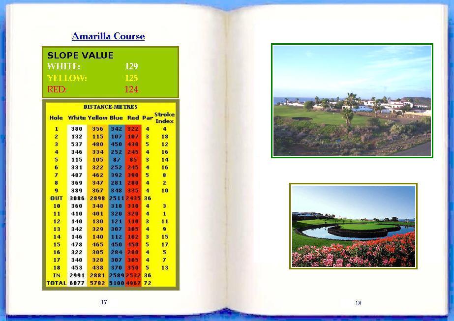 Slope Value, Amarilla Golf Course, Score Card, Tenerife Open, Par 72,6077 meters, 6077 metres, TF1 junction 24, Exit 24 TF1, Salida 24 TF1, Tenerife Golfing Favorite, Favourite Golf Location, The Amarilla facilities include driving range, putting green, pro_shop, equestrian centre and Club House with tennis court, swimming pool, bar and restaurant. It was inaugurated in 1989, and one year later Amarilla Golf hosted the second edition of the Tenerife Open, which is part of the European P.G.A. Tour, From the first tee, the player discovers the spectacular ocean views. Following on to the 2nd, 3rd and 4th holes that are surrounded by a board variety of typical Canarian flora, enormous Cannas Indicas, the beautiful Washington Palms and the very exclusive Canarian Pines. The most impressive part of the round reaches its peak at the 5th hole; this is truly a gem for golf lovers where the sea becomes a fairway, making it necessary to cross it in order to reach the green, Holes 18, Par 72, Course length 6077 metres, Designer: Donald Steel, 9 hole pitch and putt, putting green, driving range, trolleys, buggies, club house, chaanging rooms, showers, pro shop, tuition, pool, tennis, equestrian centre and club rentals, Fairways Club is situated on the south coast of the island of Tenerife within the Amarilla Golf Club complex, which has hosted the European and PGA tour. Fairways enjoys wonderful year round weather, the resort overlooks the blue Atlantic and Mount Teide the highest mountain in Spain. It is the perfect family resort in a secluded part of the island whilst within easy reach of the main attractions and places of interest of the island. The resort complex offers a wide range of activities for children, it has a large out door heated pool, with a pool bar. There is also a Clubhouse Restaurant on site which is open all day with night entertainment such as karaoke, Spanish dancing and singers. Fairways Club has been developed within an existing leisure complex, the Amarilla Golf and Country Club. The resort is situated in a very quiet area on the sunny south side of the island and boasts a variety of on-site facilities, including a swimming pool, bars and a restaurant, making it an ideal location for families with young children. Golf, tennis and horseback riding is nearby. Many apartments offer spectacular views of Mount Teide, golf course, and sea. A car is recommended as there is no public transport except taxis